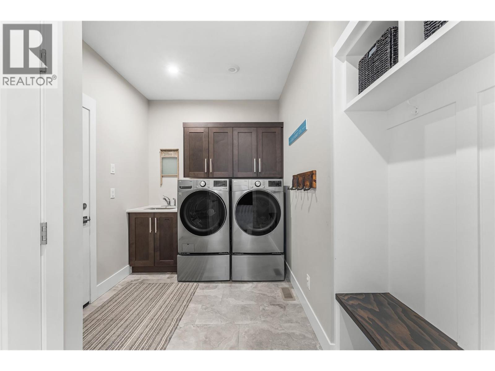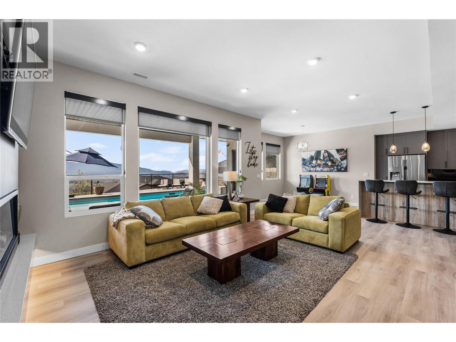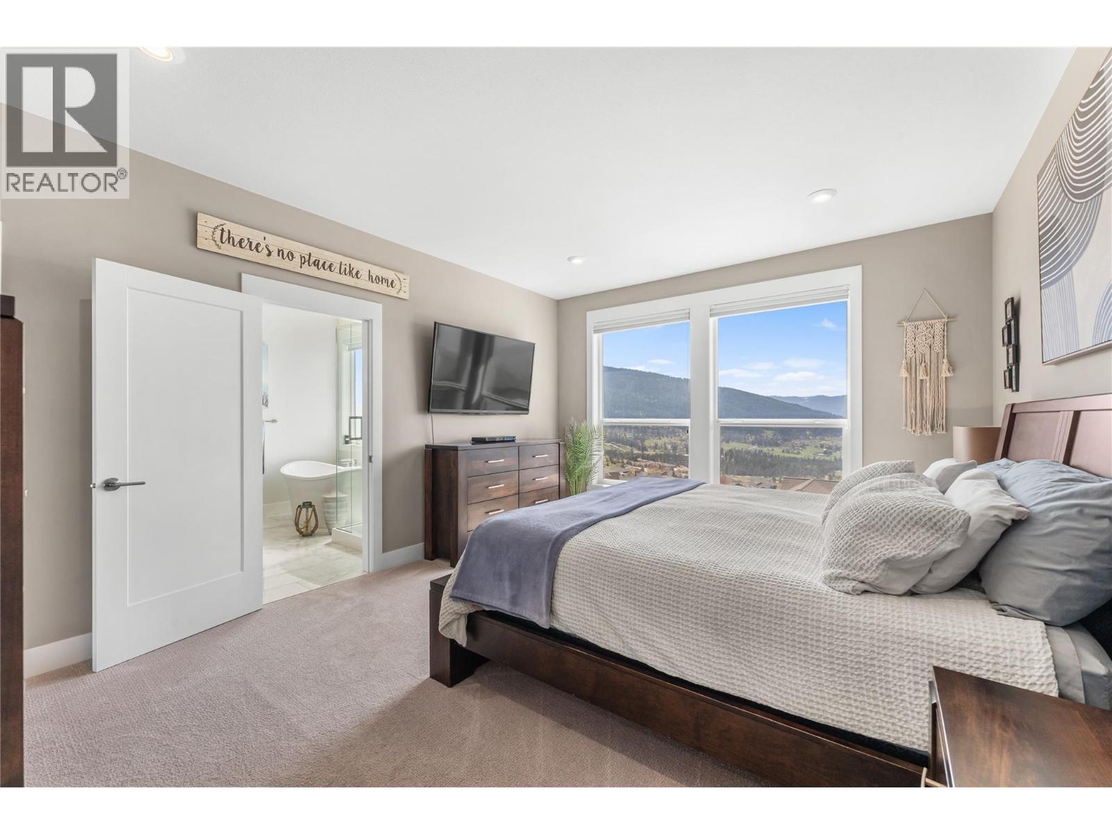 What most people envision for their dream Okanagan lifestyle; this contemporary home is designed to take full advantage of its elevated setting, with striking views of the surrounding mountains, lakes, and valley. The main floor features an open, airy layout with 11-foot ceilings, expansive windows, and direct access to a large covered deck ideal for morning coffee or maybe an evening glass of wine from a local Okanagan winery. The kitchen blends form and function with quartz countertops, stainless steel appliances, and clean-lined maple cabinetry. The primary bedroom offers a peaceful retreat with a walk-in closet and ensuite, complete with a freestanding soaker tub and custom tiled shower. An oversized second bedroom, a versatile den or third bedroom, and a well-appointed laundry room with built-in bench and storage round out the main level. Downstairs, the walk-out lower level with 10-foot ceilings provides exceptional flexibility, featuring a media room, games area, gym, wet bar, additional bedroom and spa inspired full bathroom. Outdoors, the fully automated saltwater pool with new liner and safety cover is paired with low-maintenance Synlawn turf and a custom storage shed. An oversized double garage and generous extra parking accommodate vehicles, trailers, boats, or RVs. You can be on the ski hill, hiking trails, golf course or lake all within a short drive from home. (id:6769)