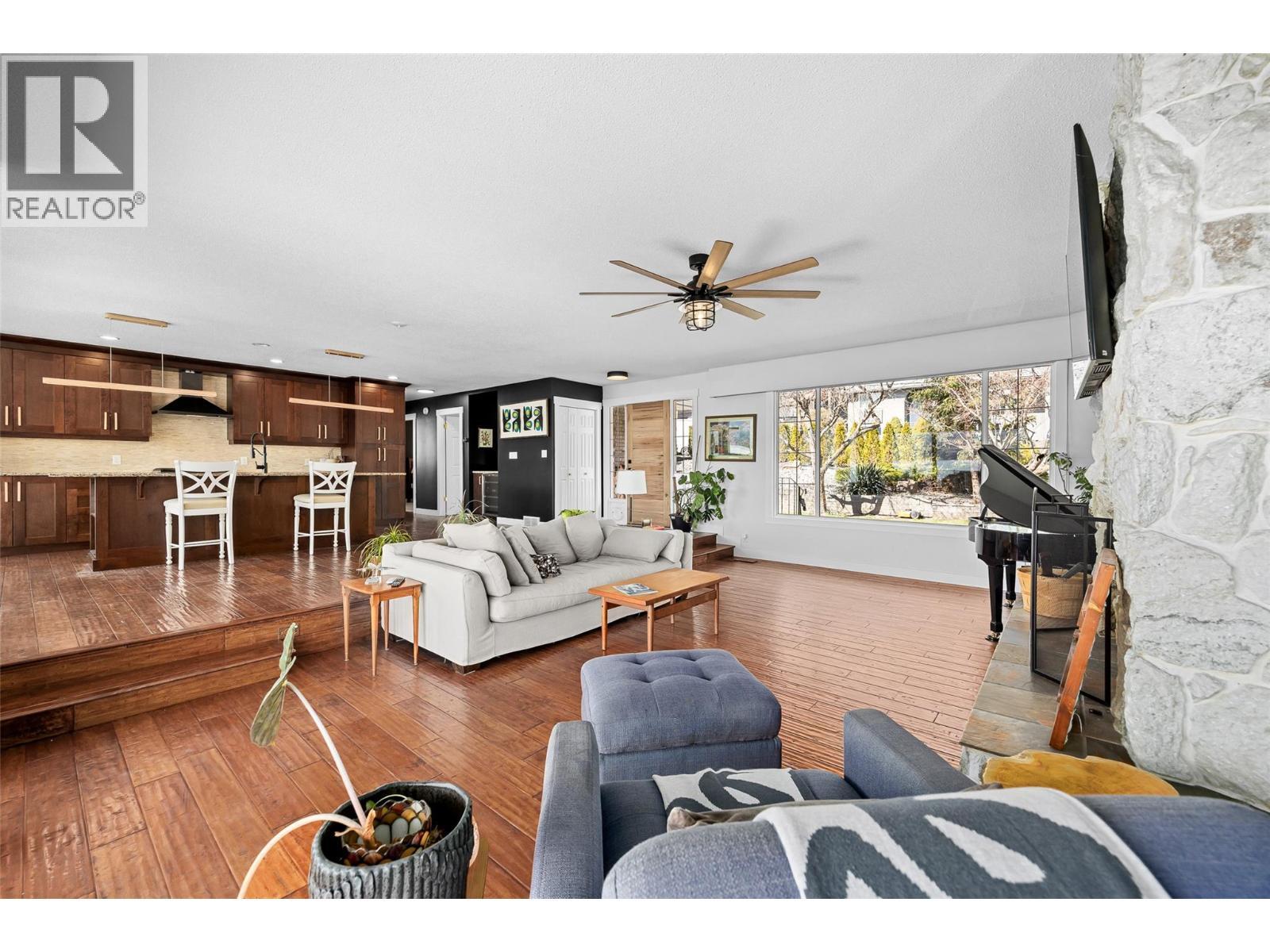 BEAUTIFUL LAKE VIEWS IN CASA LOMA! Tucked on a quiet no-through road just minutes from Downtown Kelowna, this 5 bedroom, 3 bathroom walk-out rancher offers the best of Okanagan living just a short walk to numerous beach accesses & Kalamoir Park! With views from both levels of the home, the main floor is built for gathering. An updated kitchen with a large island, gas range, stainless appliances & granite counters opens into a sunken living room centred around a cozy rock fireplace that opens to a covered balcony overlooking the yard & Okanagan Lake. Watch boats pass by, entertain friends & catch sunrise just a stone's throw away from the beach. The main level offers 3 bedrooms, including a primary retreat with lake views & a striking black 4-pc ensuite with dual vanities. A 2nd full bathroom features a soaker tub & a penny-finished floor that’s worth every cent! One bedroom is currently set up with stacker laundry for added flexibility of laundry on the main floor. Downstairs, the walk-out level has a huge rec room with stone fireplace & massive wood beams opening up to the backyard with views! Here you'll find 2 bedrooms, a refreshed 3-pc bathroom, a 2nd laundry & a partial kitchen offering suite potential or the perfect space for in-laws/teenagers. Set on a .22 acre lot with a garage, lots of storage & a fully fenced yard, this home balances privacy, space & access to everything that makes Casa Loma one of the Okanagan's best kept secrets! Fast possession possible! (id:6769)